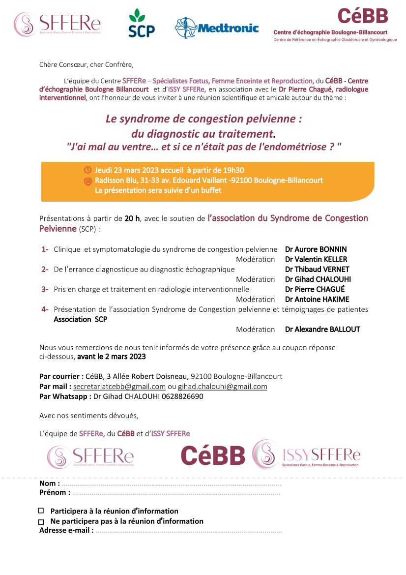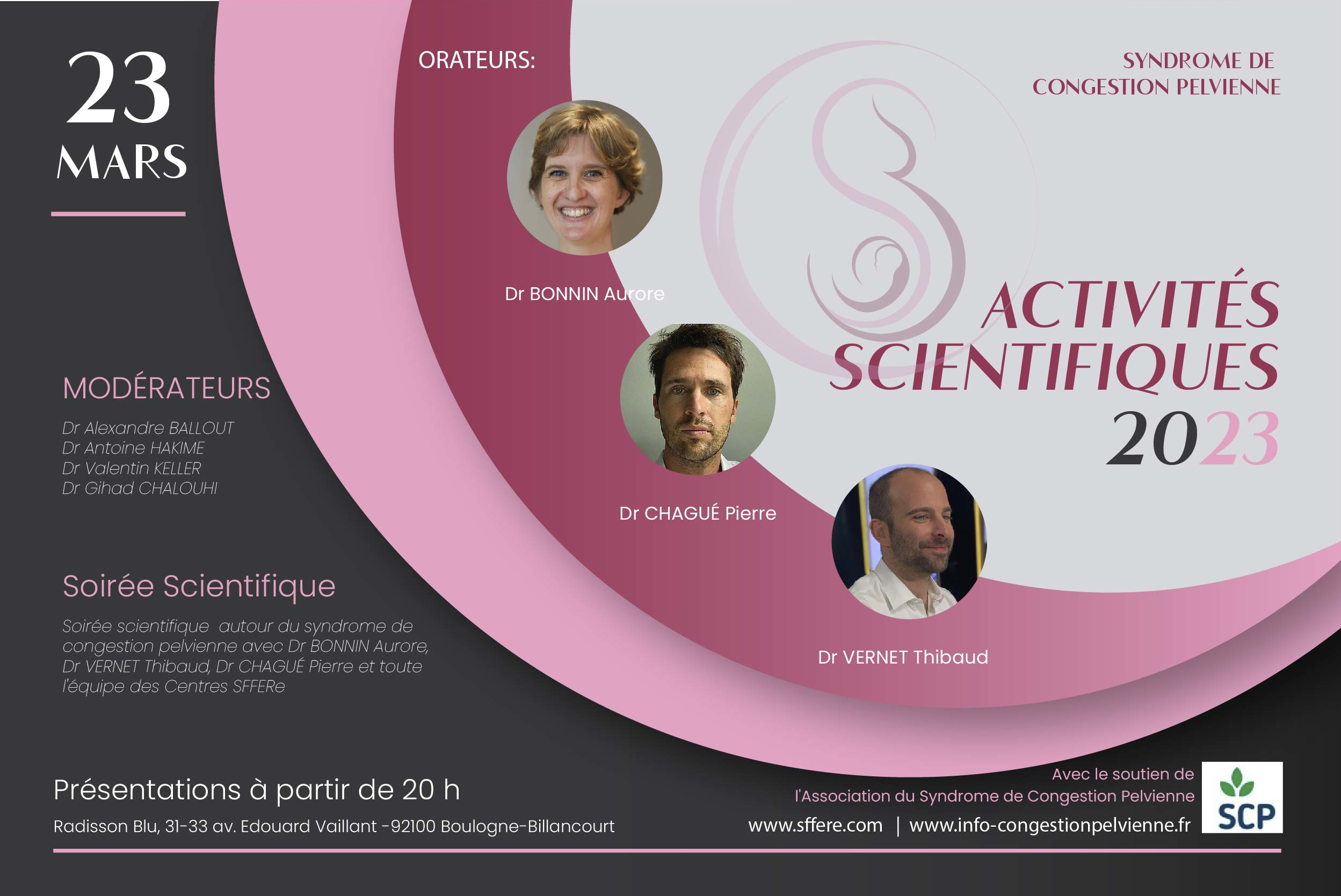 • Le 23 mars: Soirée scientifique autour du syndrome de congestion pelvienne avec Dr Bonnin Aurore, le Dr Chagué Pierre et toute l'équipe des Centres SFFERe. (Détails de l'évènement)